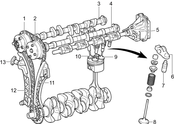 1- VVT (izplūde), 2 - VVT (ieplūde), 3 - izplūdes vārstu sadales vārpsta, 4 - ieplūdes vārstu sadales vārpsta, 5 - Valvematic kontrolieris, 6 - rokeris, 7 - hidrokompensators, 8 - vārsts, 9 - ieplūdes vārsts, 10 - izplūdes vārsts.