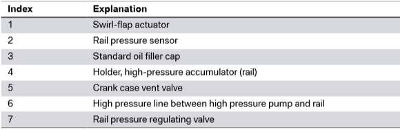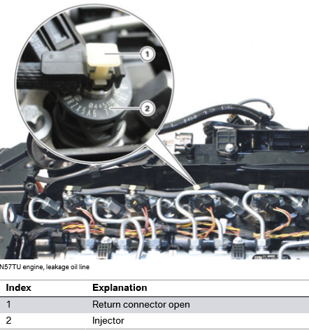 As with the N47TU the new solenoid injectors (common rail injector CRl2.5) are installed on the N57TU. They are produced by Bosch and operated with up to 1800 bar fuel pressure. Along with the increased maximum pressure, the number of possible switching actuations over the service life was also increased by 50%. It has multiple injection capability and also allows the implementation of very short switching times. The new solenoid injector delivers improved HC and CO emissions with the same power and consumption data as the 1800 bar piezo injector. An additional advantage of the solenoid type injector is the low manufacturing costs compared to piezo injectors.