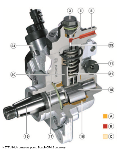 The N57TU engine is fitted with a twin-piston high pressure pump with the designation CP4.2.