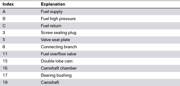 Volumetric flow regulation by the quantity control valve: The quantity control valve only allows the amount of fuel to flow into the high pressure pump from the low-pressure side that is required in order to generate the required fuel rail pressure. The high-pressure pump cylinder is not completely filled with fuel. The higher the control signal current, the lower the rail pressure that is generated. The rail-pressure regulating valve is not supplied with current for the maximum pressure. The rail-pressure regulating valve is supplied with slightly higher current than would be necessary for setting the target pressure. • Pressure regulation by the rail pressure control valve: The high-pressure pump provides a constant supply of highly-pressurised fuel to the rail. The rail pressure regulating valve diverts excess fuel arriving in the rail into the return line. The higher the control signal current, the higher the rail pressure that is maintained. The flow regulating valve is set to maximum flow. • Combined closed-loop control with simultaneous regulation from the rail pressure regulating valve and the quantity control valve: At extremely low fuel-injection quantities of less than roughly 4 mg (on trailing throttle/overrun) the rail pressure regulating valve must discharge a certain amount of fuel from the high-pressure system. The reason is that the high-pressure pump cannot run with zero delivery. This means that the high-pressure pump supplies fuel to the high-pressure system even when the quantity control valve (flow regulating valve) is closed. This would lead to excessive rail pressure and thus to a control deviation.