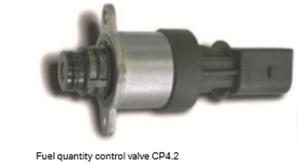 The fuel-quantity control valve (also known as flow regulating valve) is mounted on the CP4.2 highpressure pump . The fuel-quantity control valve is controlled using a pulse-width-modulated signal. The DDE controls the fuel-quantity control valve at various pulse-duty factors while the fuel-quantity control system is active. The system adjust rail pressure to the specified level as calculated by the DDE. The fuel-quantity control valve regulates the fuel flow from the low-pressure side to the highpressure side of the high-pressure pump. This is how the desired fuel-rail pressure is achieved. Progressive reductions in the amount of fuel that the fuel-quantity control valve allows to flow to the high-pressure side produce corresponding reductions in the level to which the high-pressure pump charges the cylinders. The consequence is that less rail pressure is built up. The high-pressure pump generates pressure to maintain a constant level in the rail.