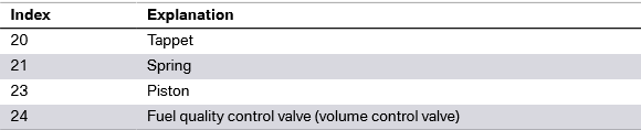 When volumetric flow regulation is active, the DDE controls the fuel-quantity control valve (flow regulating valve) by means of a variable pulse duty factor in order to set the rail pressure to the level calculated by the DDE. The fuel-quantity control valve controls the flow of fuel into the high pressure pump from the low-pressure side, thereby controlling fuel-rail pressure as required. The less fuel the flow regulating valve allows to flow into the high pressure side, the less the radial cylinder of the highpressure pump is filled. The consequence is that less rail pressure is built up.