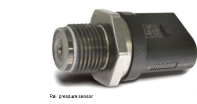 A diaphragm with strain resistors is integrated in a metal housing. The measuring range of the sensor is dependent on the thickness of the diaphragm. The thicker the diaphragm, the higher the measurable pressure. The rail pressure sensor detects the current pressure in the rail. The pressure in the rail is of crucial importance to fuel injection. This measurement must be performed with great precision and within a suitably short period of time. If the rail pressure sensor fails, a fault is stored in the Digital Diesel Electronics and pressure regulation is activated "blind" by means of default values.