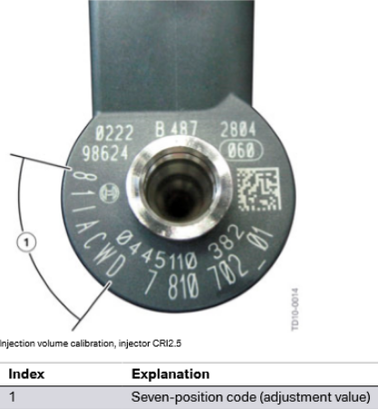 Due to the tolerance during manufacture of the injectors, the actual injected fuel volume deviates only slightly from the calculated fuel volume. This deviation is determined after manufacturing each injector by measurements in several operating conditions. For each injector an adjustment value (code) is generated from these measurements. For vehicle assembly, the compensation value of each injector is stored in the control unit after the installation of the Digital Diesel Electronics.