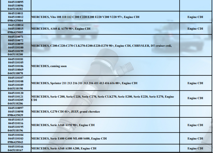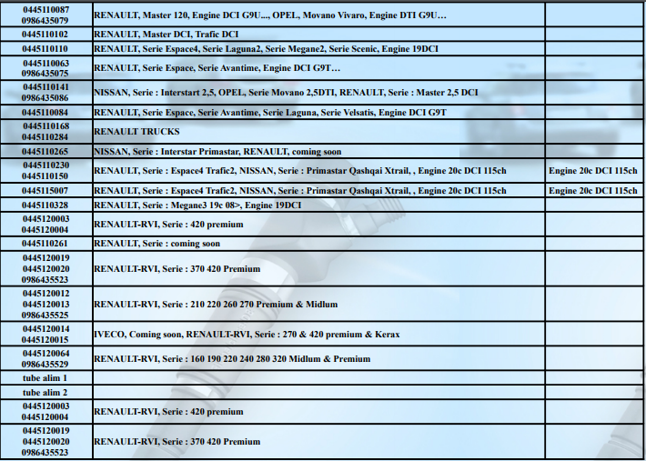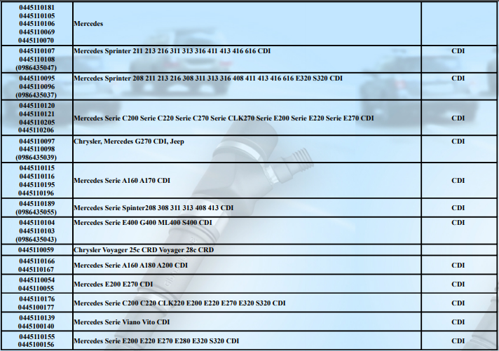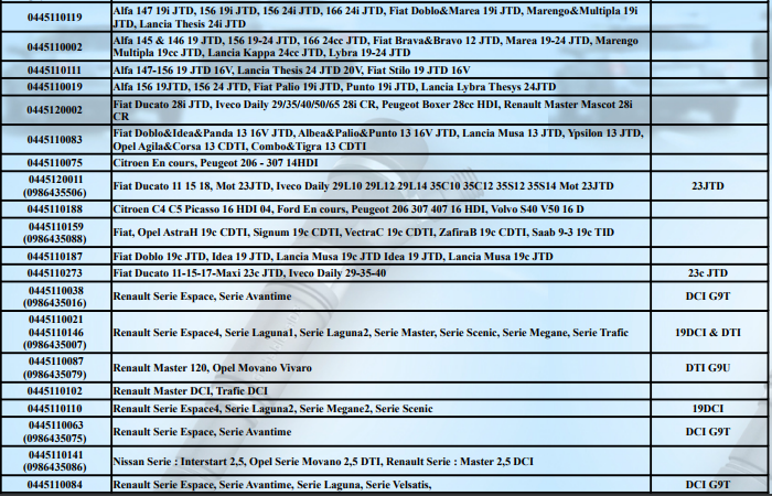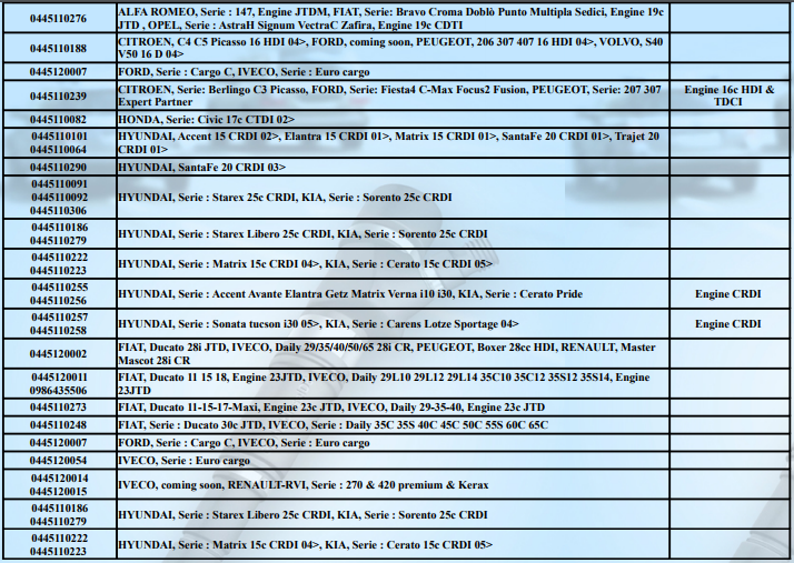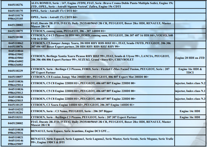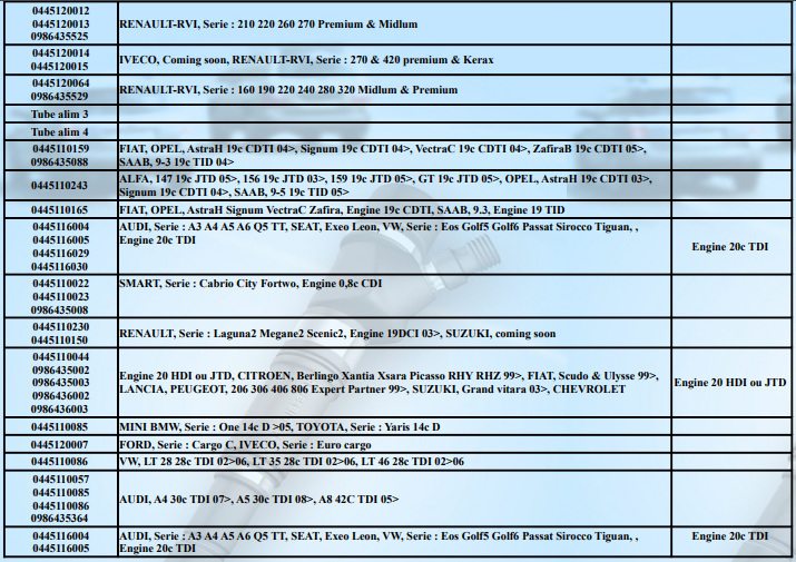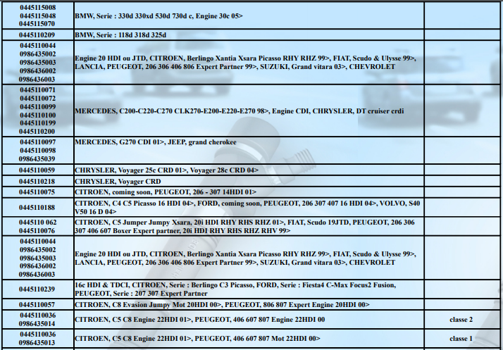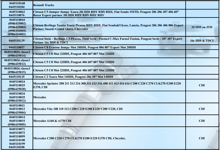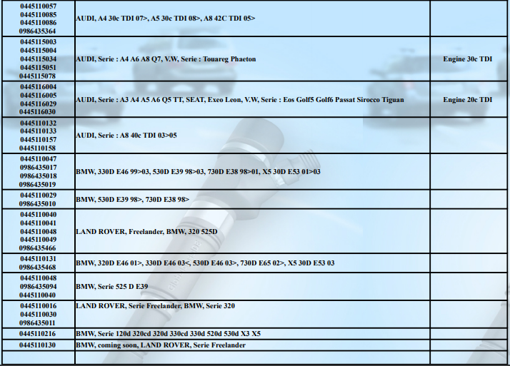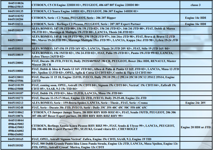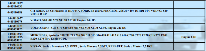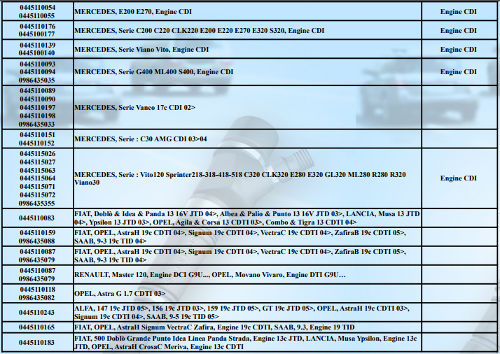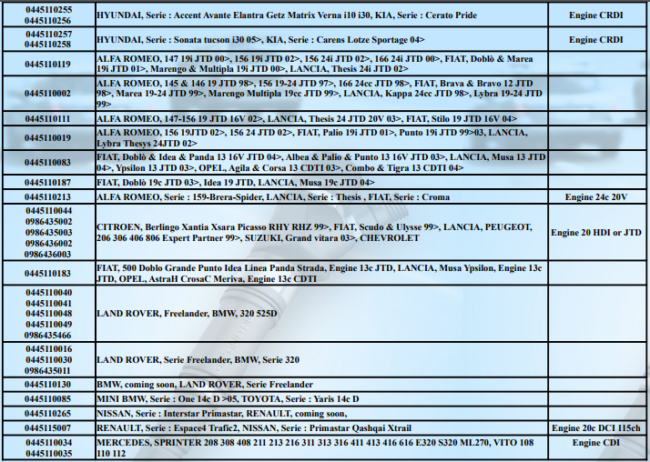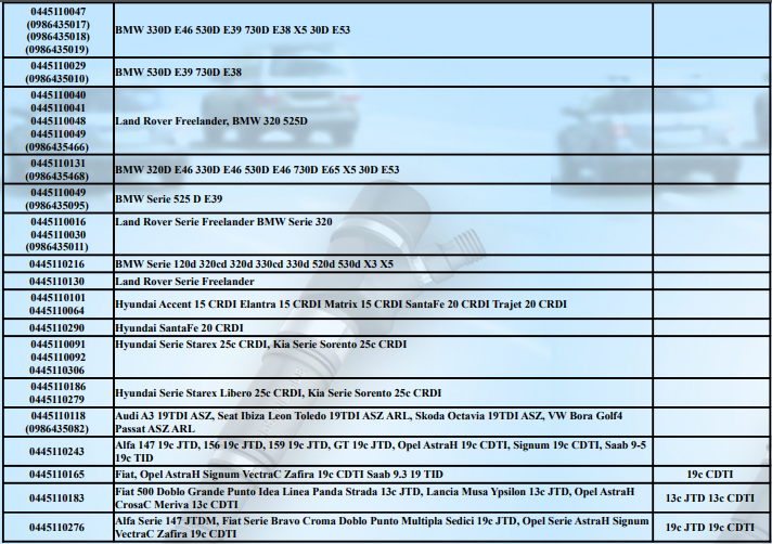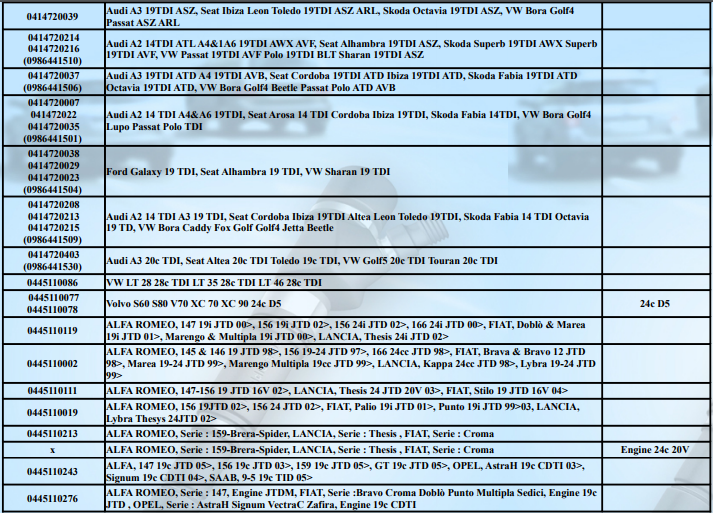 BOSCH Common Rail sprauslu pielietojuma tabula