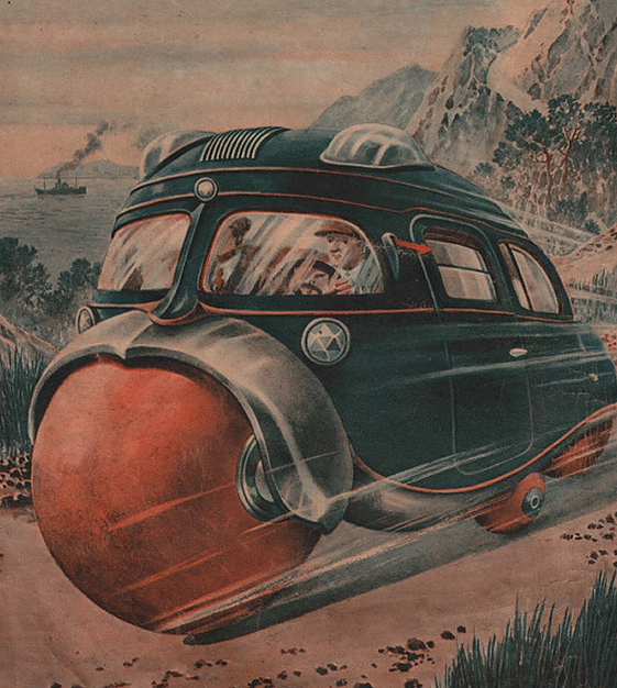 atrast daudz fantastisku nākotnes automobiļu variantu - trīs riteņu, lidojošu, peldošu, zemūdens utt.